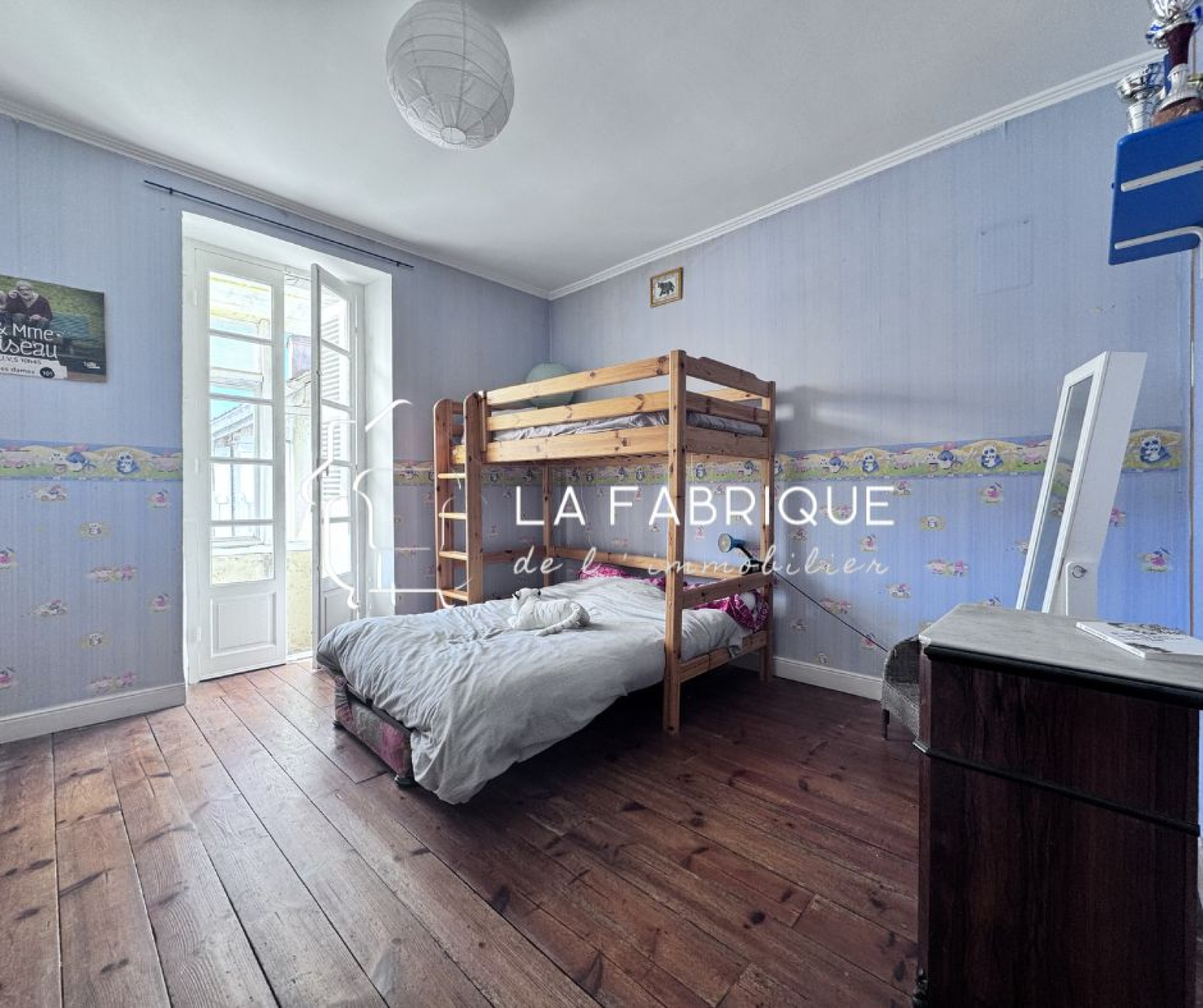 À mi-chemin entre les étages, une grande chambre offre un espace plus intime, presque confidentiel.